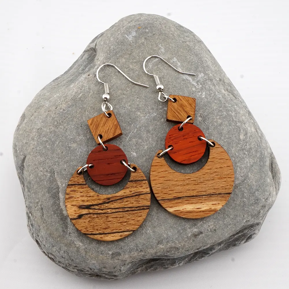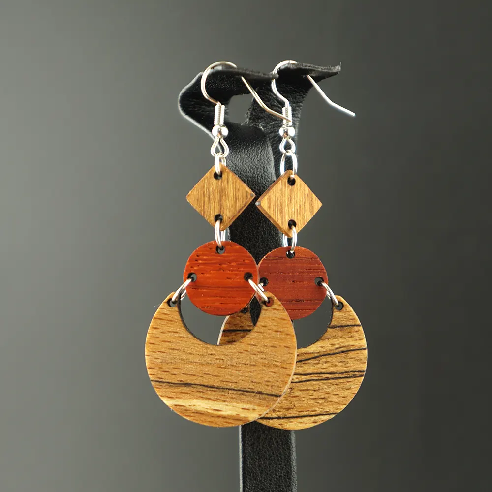 Harmonie der Kontraste. Diese dreistufigen Statement-Ohrringe vereinen die Wärme gelerntem Robinienholzes mit dem feurigen Rot des Padouks und der einzigartigen Maserung gestockter Buche. Ein geometrisches Kunstwerk, das durch seine außergewöhnliche Formgebung und natürliche Farbenpracht besticht.