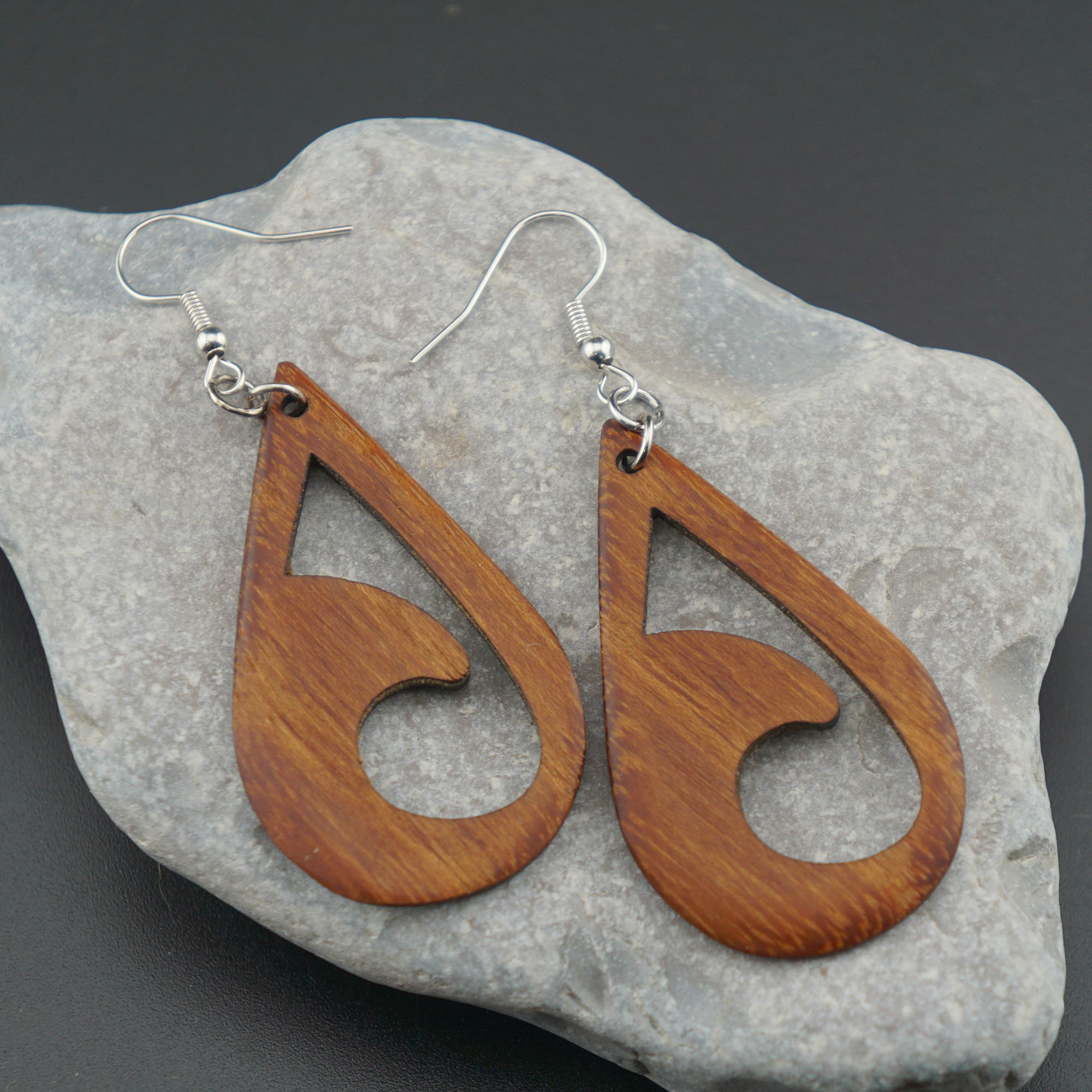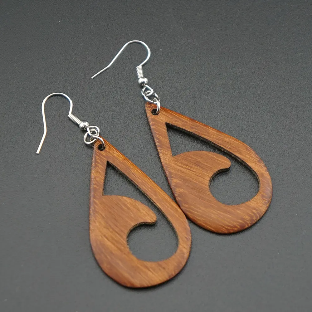 Harmonie der Kontraste. Diese filigranen Ohrringe aus gelerntem Akazienholz bestechen durch ihre elegante Tropfenform und das kunstvoll durchbrochene Wellen-Design. Ein exklusives Stück tragbare Kreativität, das durch seine natürliche Wärme und Leichtigkeit überzeugt.