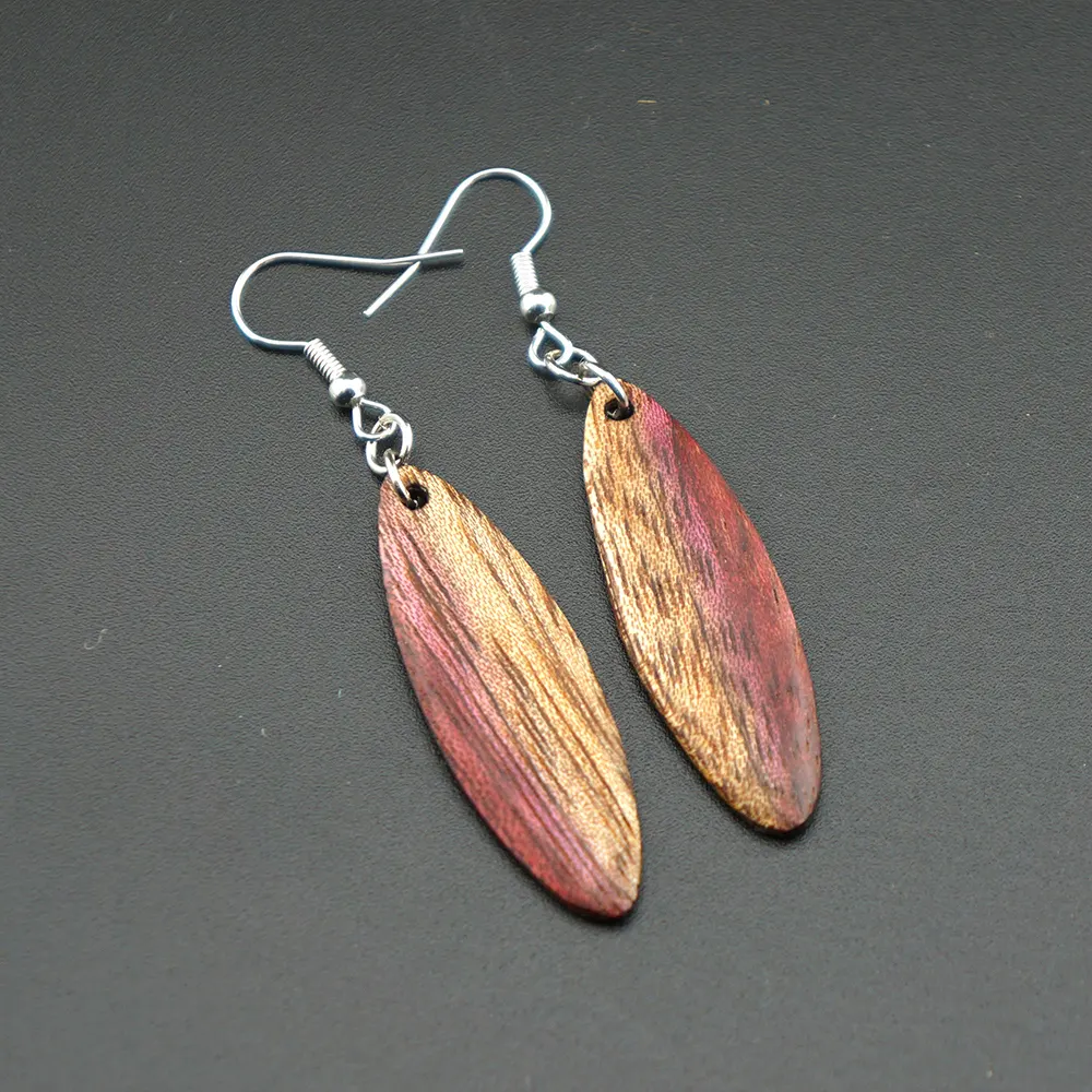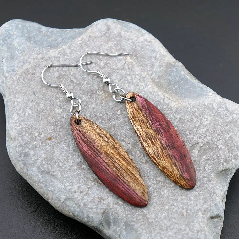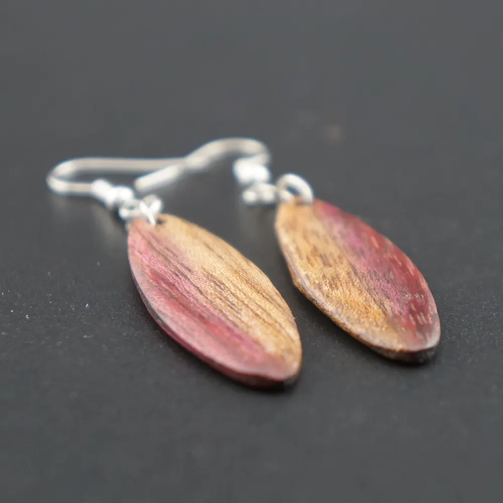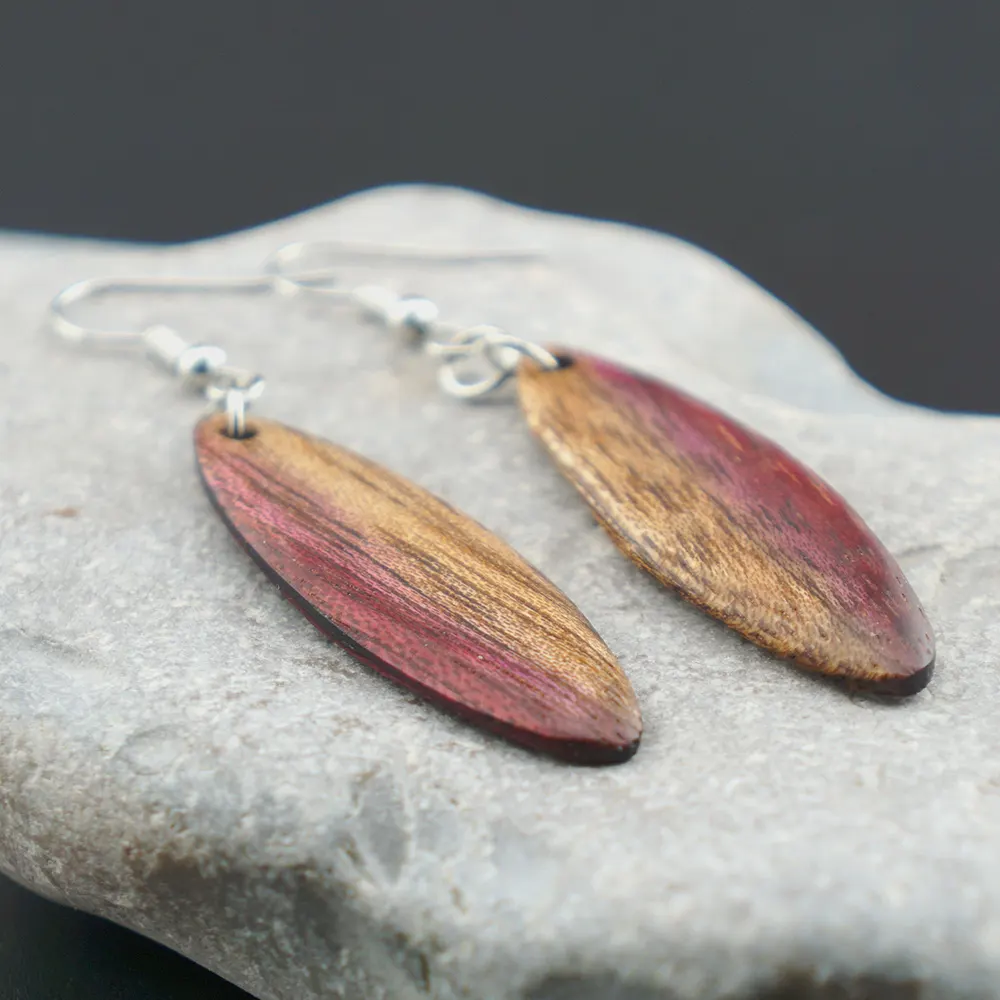 Naturphänomen in Lila und Gold. Diese handgefertigten Ohrringe aus Amaranth-Holz faszinieren durch einen seltenen, natürlichen Farbübergang von tiefem Purpur zu schimmerndem Goldgelb. Ein exklusives Stück tragbare Kreativität, das die Einzigartigkeit der Natur in einer eleganten Ellipsenform feiert.
