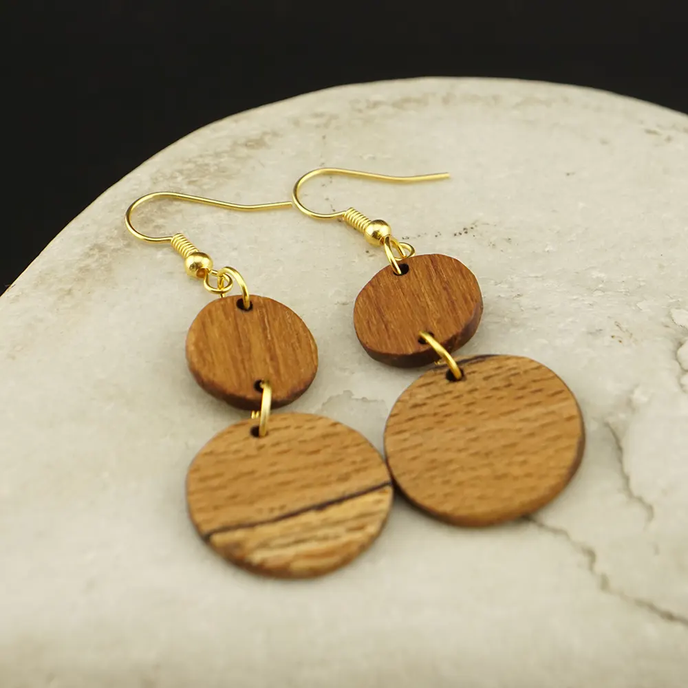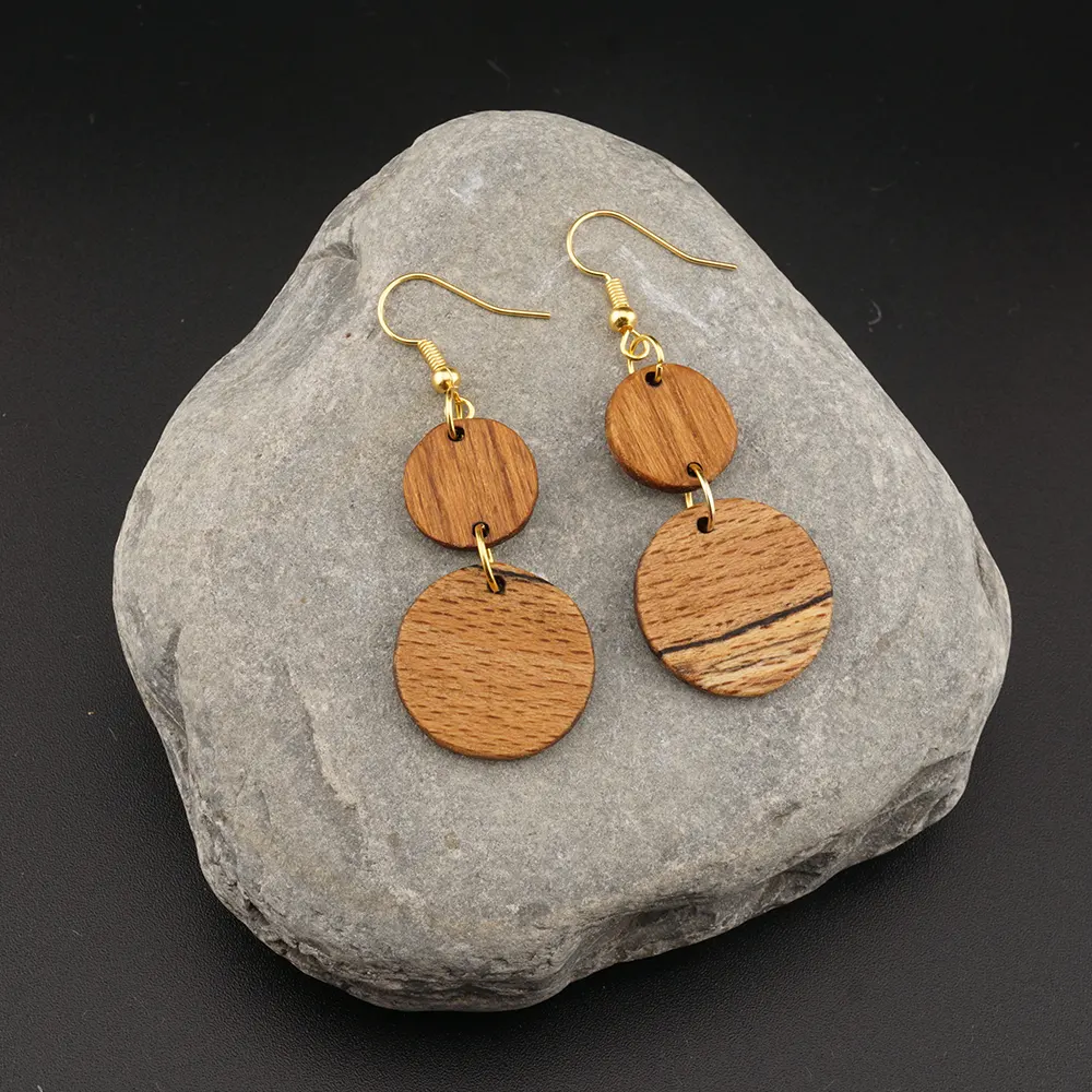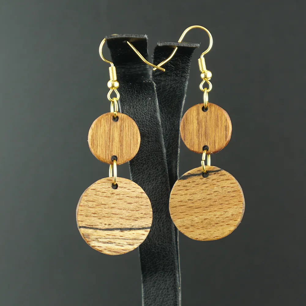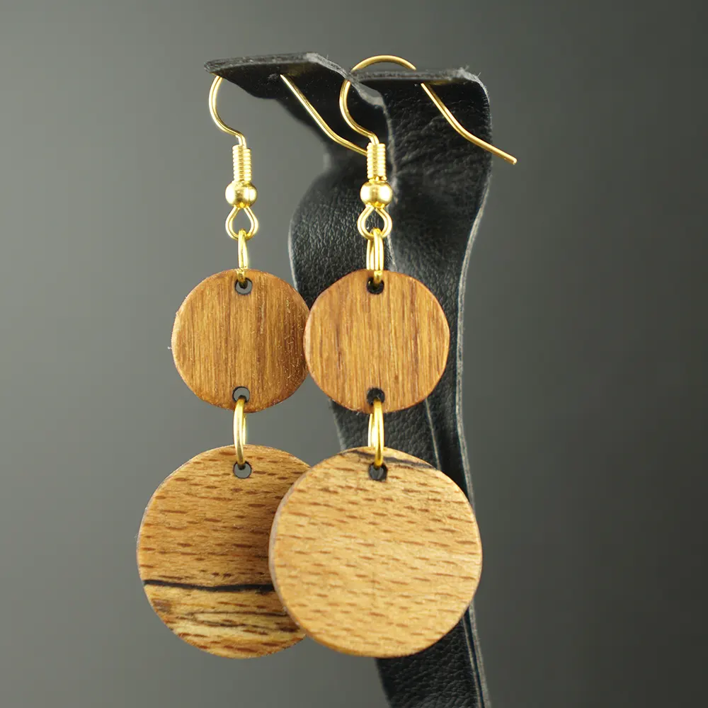 Sanfte Geometrie in Naturtönen. Diese handgefertigten Ohrringe kombinieren zwei perfekt aufeinander abgestimmte Holzkreise: Ein oberes Element aus warmbrauner Robinie und ein größeres unteres aus charaktervoll gezeichneter, gestockter Buche. Vollendet mit vergoldeten Details für einen eleganten, zeitlosen Look.
