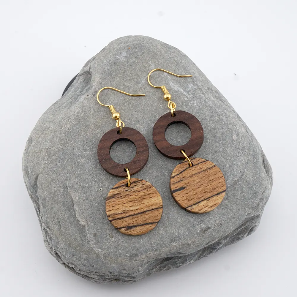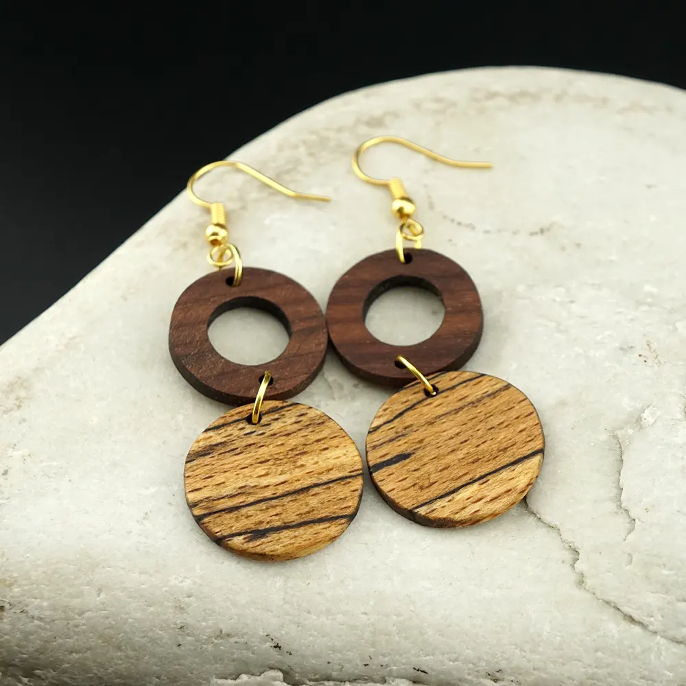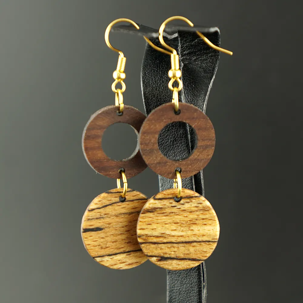 Zeitlose Eleganz in Dunkel und Hell. Diese handgefertigten Ohrringe kombinieren einen filigranen Ring aus edlem Walnussholz mit einem teli Anhänger aus gestockter Buche. Ein harmonisches Zusammenspiel natürlicher Strukturen, veredelt mit goldenen Details für einen modernen Look.