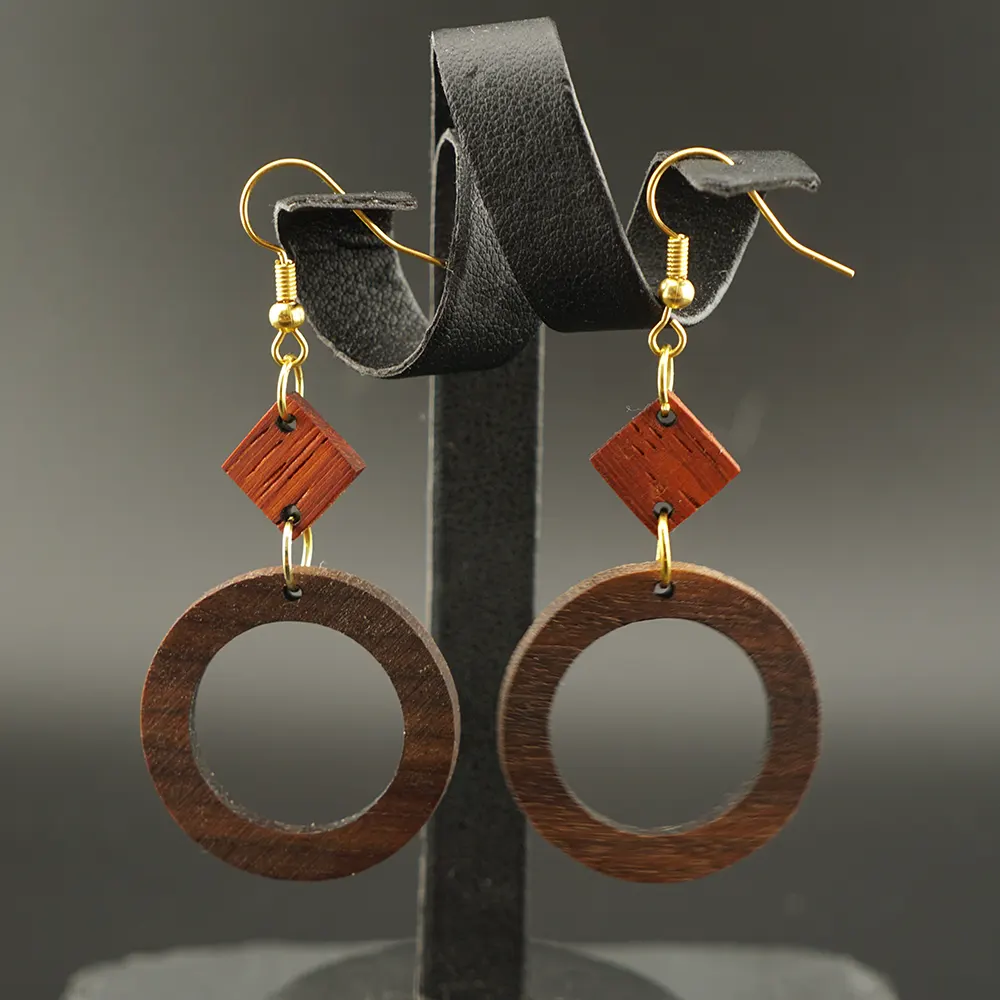 Kraftvolle Farben, klare Formen. Diese handgefertigten Ohrringe kombinieren ein markantes Quadrat aus leuchtend rotem Padouk mit einem großen, filigranen Ring aus edlem Walnussholz. Ein minimalistisches Statement-Accessoire, das durch den Kontrast von geometrischer Strenge und natürlicher Wärme besticht.