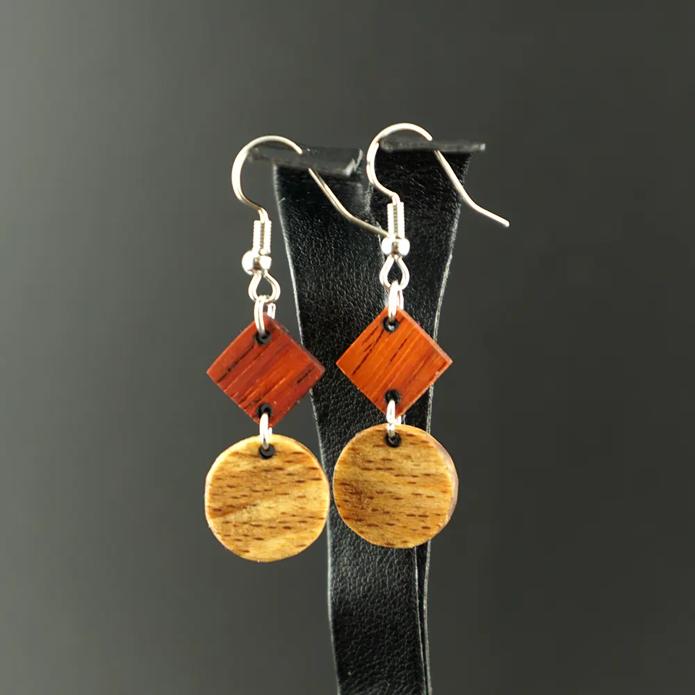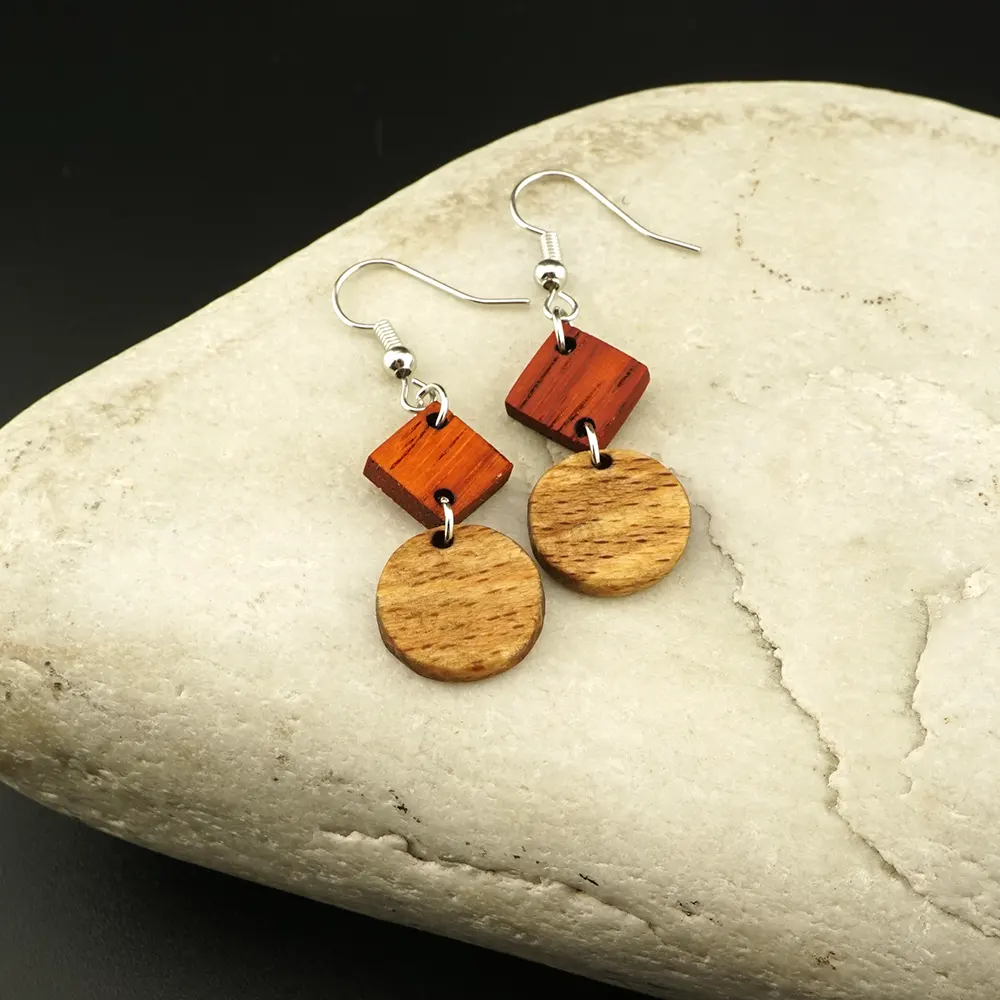 Natürliche Kontraste in Perfektion. Diese liebevoll handgefertigten Ohrringe kombinieren ein markantes Quadrat aus leuchtendem Padouk mit einem runden Anhänger aus gestockter Buche. Ein minimalistisches Accessoire, das durch die Verbindung von tragbarer Kreativität und edlen Naturmaterialien besticht.