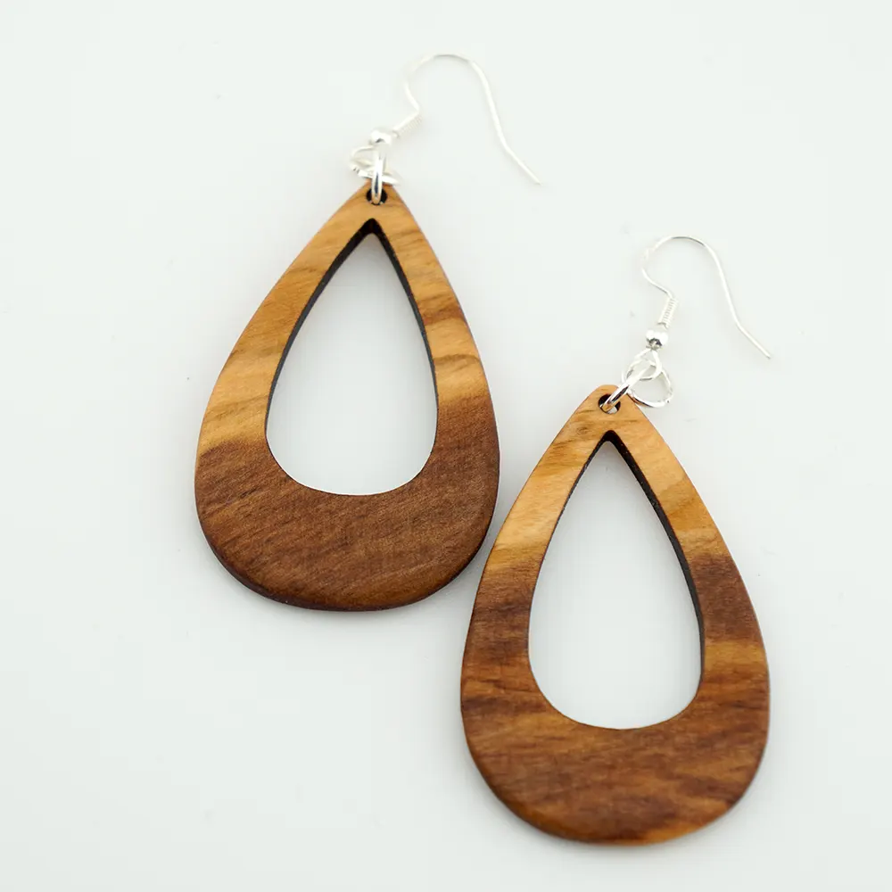 Dieses Modell von TinyArt zeigt die Olivenholz-Maserung von ihrer schönsten Seite. Die weiche, fließende Tropfenform mit der präzisen Aussparung in der Mitte lässt das Licht durch das Schmuckstück spielen und betont die lebendigen Farbkontraste des Holzes – ein exquisites Stück Wearable Art für jeden Anlass.