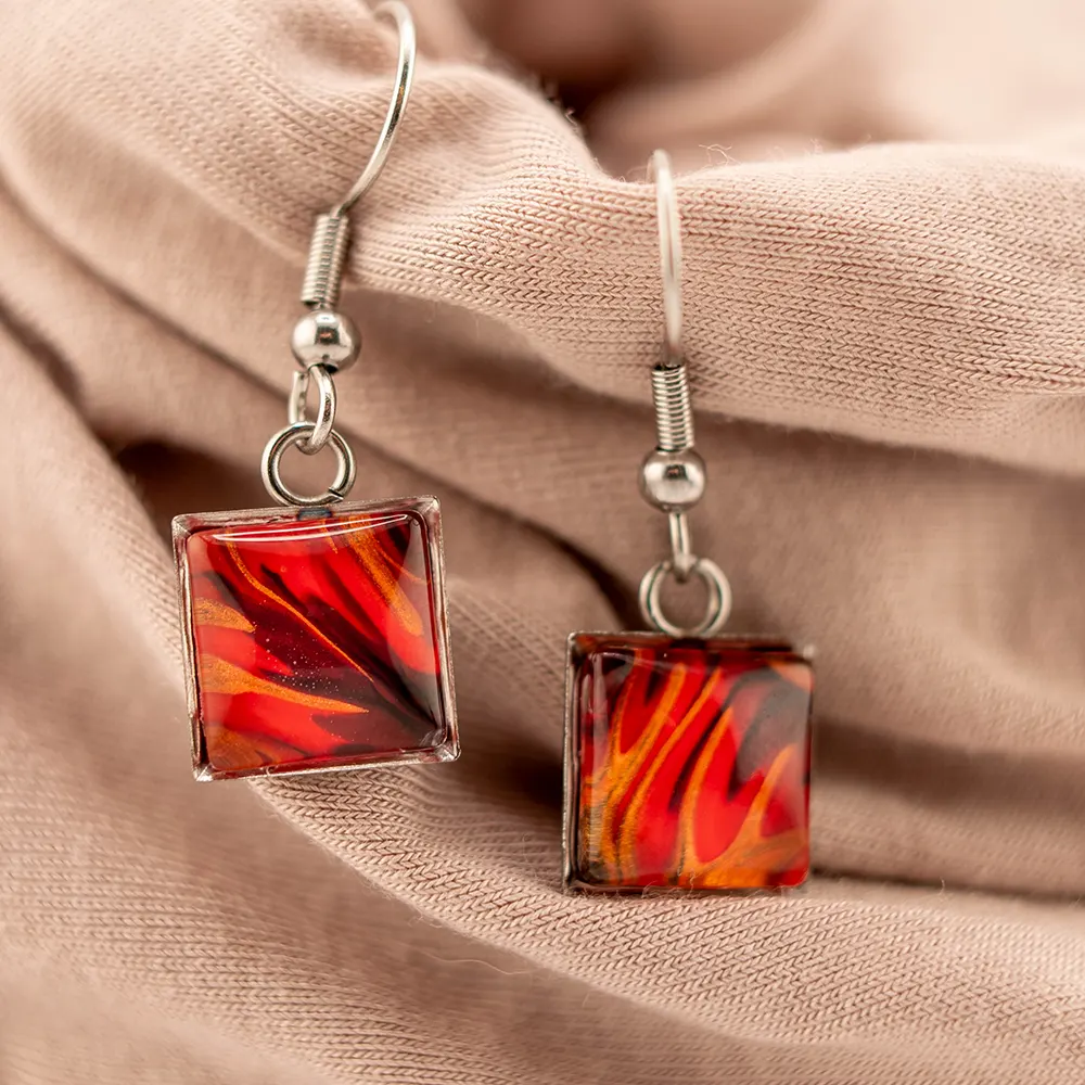 Setzen Sie ein Statement mit Schmuckstücken, die so individuell sind wie Sie selbst. Diese runden Ohrringe entstehen durch eine aufwendige Gießtechnik, bei der sich tiefes Rot und leuchtendes Orange zu organischen, fließenden Mustern verbinden. Da die Farben bei jedem Guss anders verlaufen, ist jedes Paar ein absolutes Unikat.