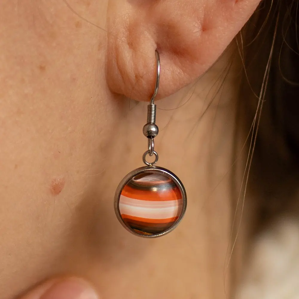 Setzen Sie ein Statement mit Schmuckstücken, die so individuell sind wie Sie selbst. Diese runden Ohrringe entstehen durch eine aufwendige Gießtechnik, bei der sich tiefes Rot und leuchtendes Orange zu organischen, fließenden Mustern verbinden. Da die Farben bei jedem Guss anders verlaufen, ist jedes Paar ein absolutes Unikat.