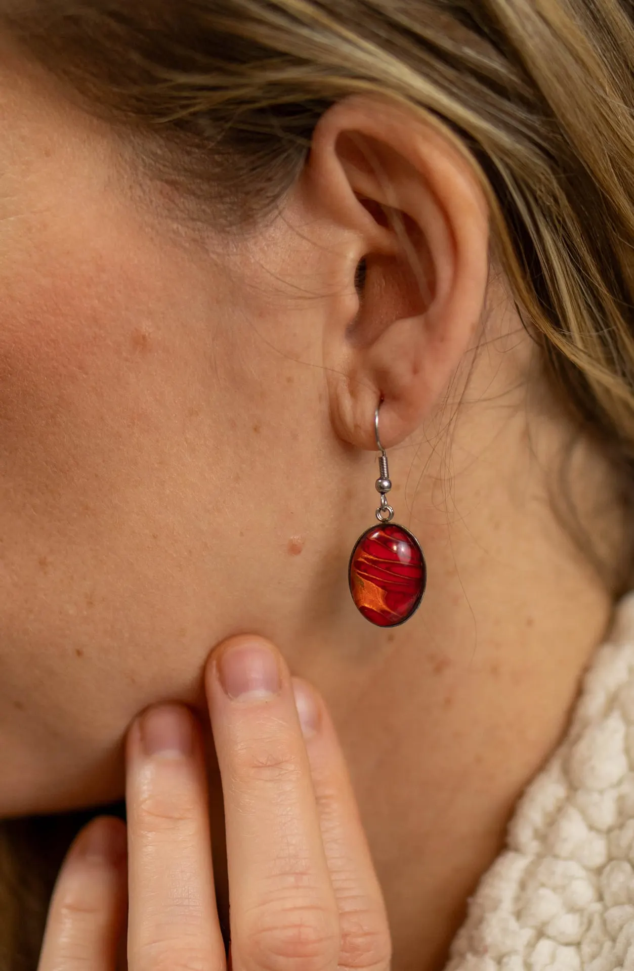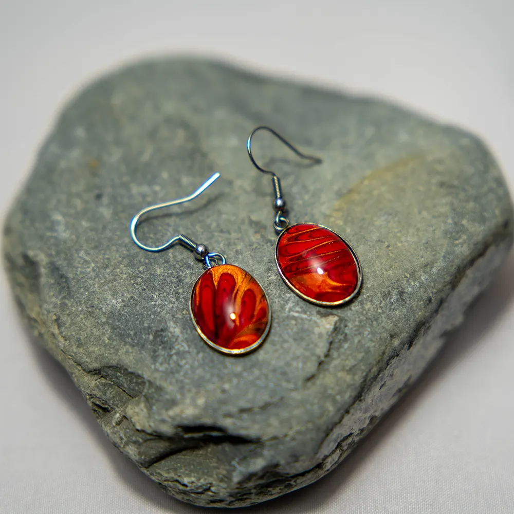 Setzen Sie ein Statement mit Schmuckstücken, die so individuell sind wie Sie selbst. Diese runden Ohrringe entstehen durch eine aufwendige Gießtechnik, bei der sich tiefes Rot und leuchtendes Orange zu organischen, fließenden Mustern verbinden. Da die Farben bei jedem Guss anders verlaufen, ist jedes Paar ein absolutes Unikat.