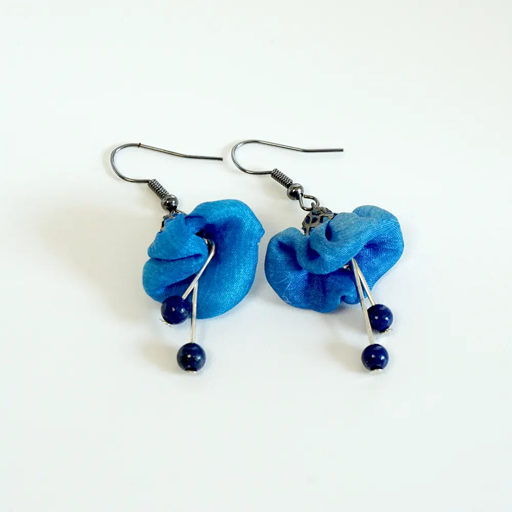 Eleganz in Königsblau: Handgefertigte Seidenblumen-Ohrringe „Nachtblau“ Verleihen Sie Ihrem Look einen Hauch von Mystik. Diese federleichten Ohrringe aus feinster Seide bestechen durch ihr tiefes Königsblau und die edle Kombination mit echten Lapislazuli-Edelsteinperlen. Ein künstlerisches Unikat, das Eleganz und Leichtigkeit perfekt vereint.