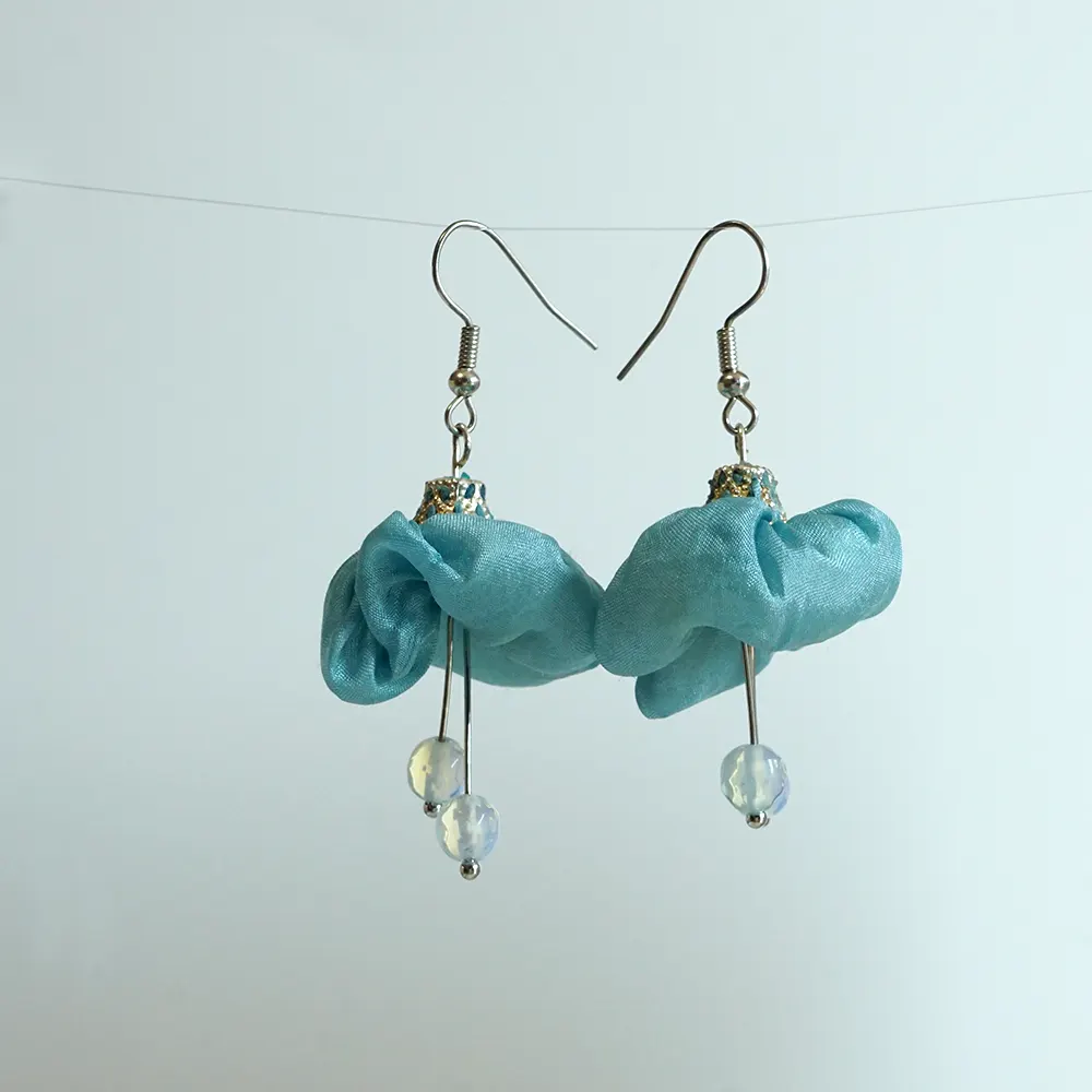 Entdecken Sie ein Schmuckstück, das so leicht und klar wirkt wie ein wolkenloser Morgenhimmel. Unsere hellblauen Seidenblumen-Ohrringe sind kleine, handgefertigte Kunstwerke, die durch ihre sanfte Farbe und den faszinierenden Schimmer des Edelsteins bestechen.