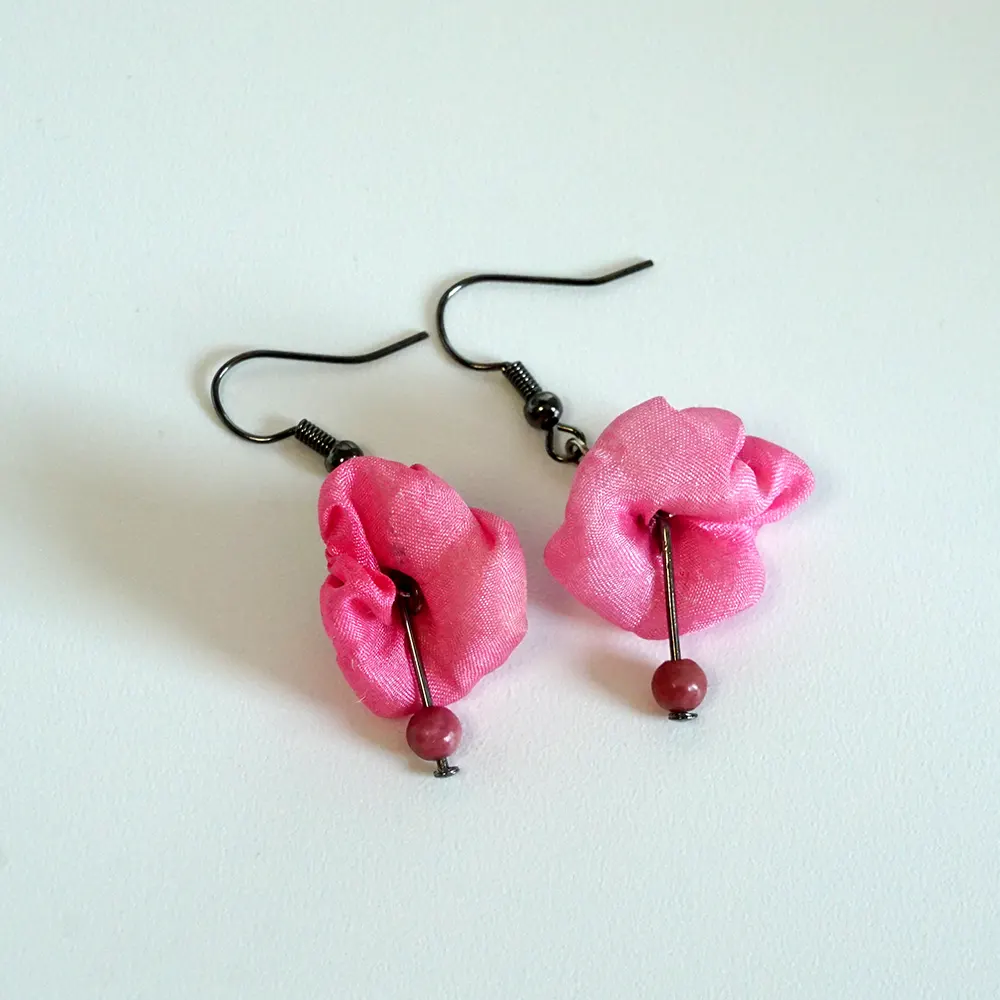 Romantik in Rosa: Handgefertigte Seidenblumen-Ohrringe „Babarózsa“ Zart wie eine Frühlingsblüte. Diese federleichten Ohrringe aus rosa Seide sind mit echtem Rosenquarz und Quarzperlen veredelt. Die Kombination mit silbernen Metallelementen verleiht diesem handgefertigten Unikat eine besonders elegante Note.