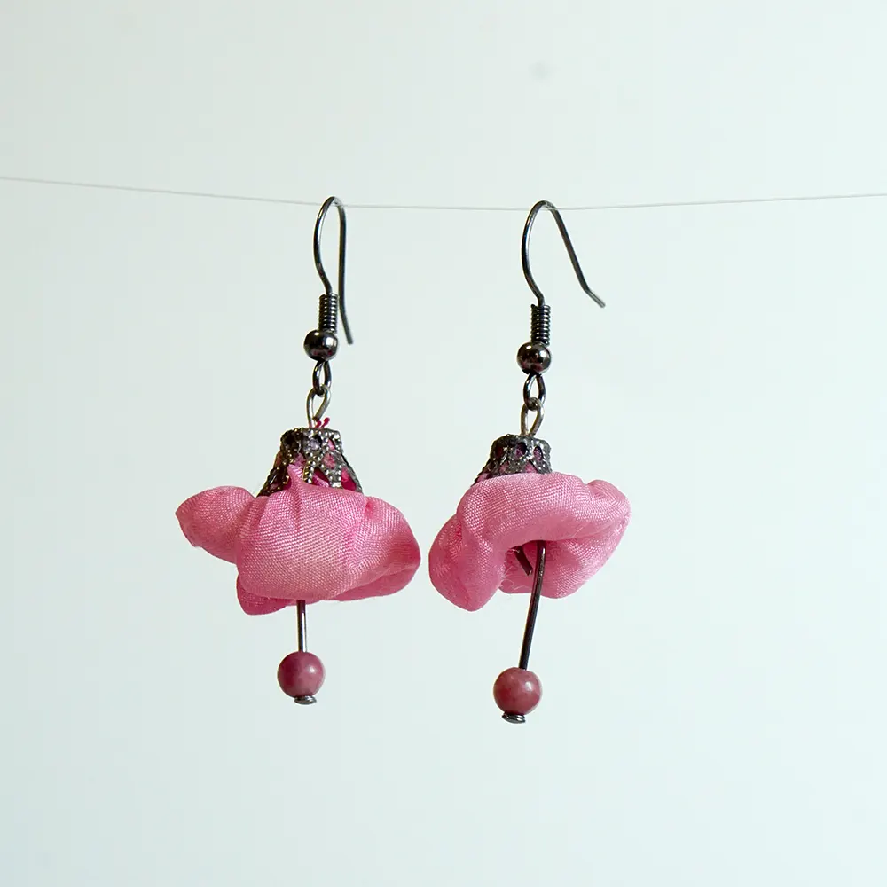 Verleihen Sie Ihrem Auftritt eine romantische und zugleich edle Note. Unsere „Babarózsa” Seidenblumen-Ohrringe in sanftem Rosa fangen die Leichtigkeit einer blühenden Blume ein und kombinieren sie mit der zeitlosen Schönheit von Natursteinen.