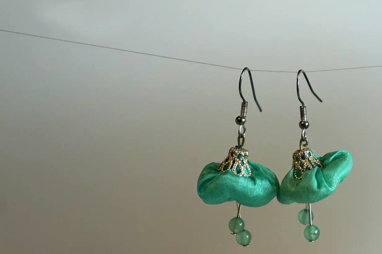 Richtig aufbewahren: Am wohlsten fühlen sich deine Ohrringe an einem trockenen, dunklen Ort (z. B. in einem Schmuckkästchen). Direkte Sonne kann die Farben der Seide mit der Zeit verblassen lassen.