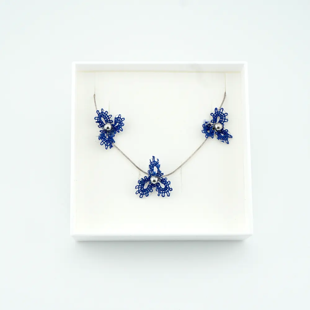 Dieses Set verbindet die Ruhe der blauen Farbe mit der Eleganz von Silber. Jedes kleine Detail der handgefertigten Blümchen zeugt von der Geduld und Präzision der Schöpferin. Das Ergebnis der 2 bis 12-stündigen Arbeit ist ein luftiges Accessoire, das im Sinne von „TinyArt of life“ die innere Harmonie und den klaren Stil betont. Eine perfekte Wahl für alle, die feine, aber eindrucksvolle Accessoires lieben.