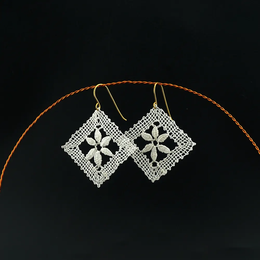 In klassischer Klöppeltechnik gefertigte, viereckige Ohrringe mit einem feinen Blumenmotiv in der Mitte. Die Verbindung von geometrischer Form und sanftem Blumenmuster strahlt eine klare und romantische Eleganz aus. Ein zeitloses Accessoire mit vergoldeten Metall-Accessoires.