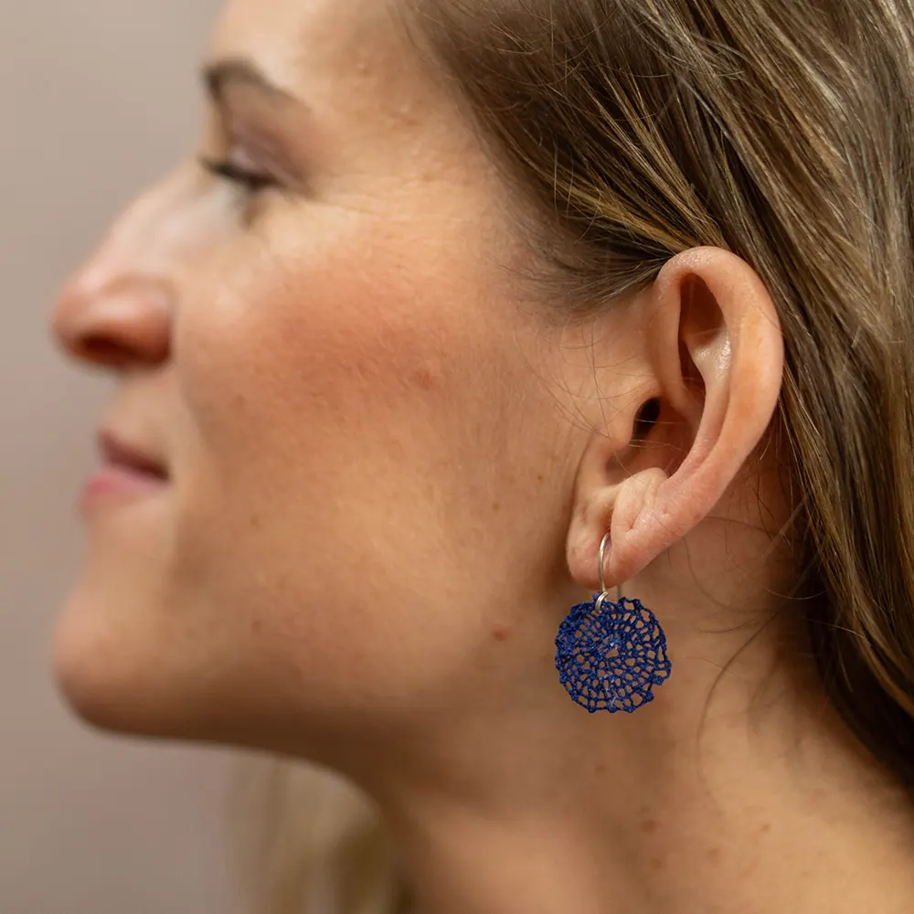 In diesem Schmuckstück treffen die Tiefe des Königsblaus und die unendliche Dynamik der Spirale aufeinander. Hinter jeder Windung der in traditioneller Klöppeltechnik gefertigten runden Form steht konzentrierte Aufmerksamkeit. Je nach Muster nimmt die Herstellung eines solchen Paares 2 bis 12 Stunden in Anspruch, bis die blauen Fäden ihre endgültige, präzise Form annehmen.