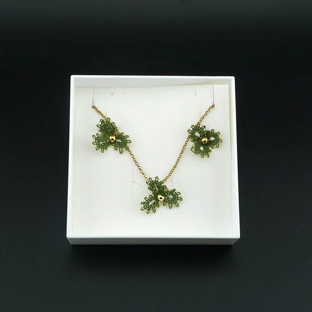 In diesem Set bilden die Frische der grünen Farbe und die Wärme von Gold eine perfekte Einheit. Hinter jedem Stich der kleinen Blumenmotive an den Ohrringen und der Halskette steht konzentrierte Aufmerksamkeit. Je nach Muster nimmt die Herstellung eines solchen Stücks 2 bis 12 Stunden in Anspruch. Dieses Set vermittelt das Lebensgefühl von „TinyArt of life“: Es bringt die Nähe zur Natur und den Wert von Handarbeit in den Alltag.
