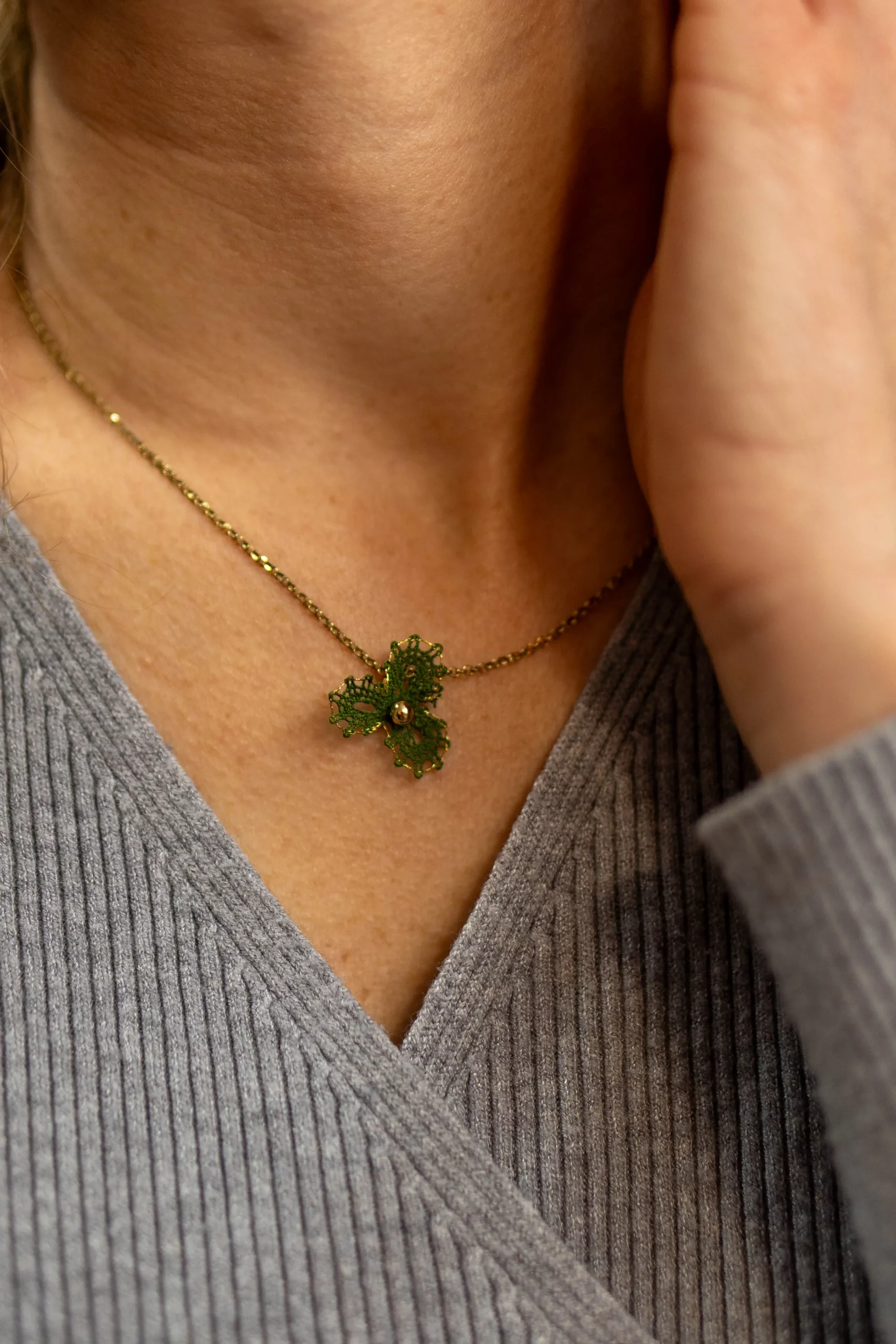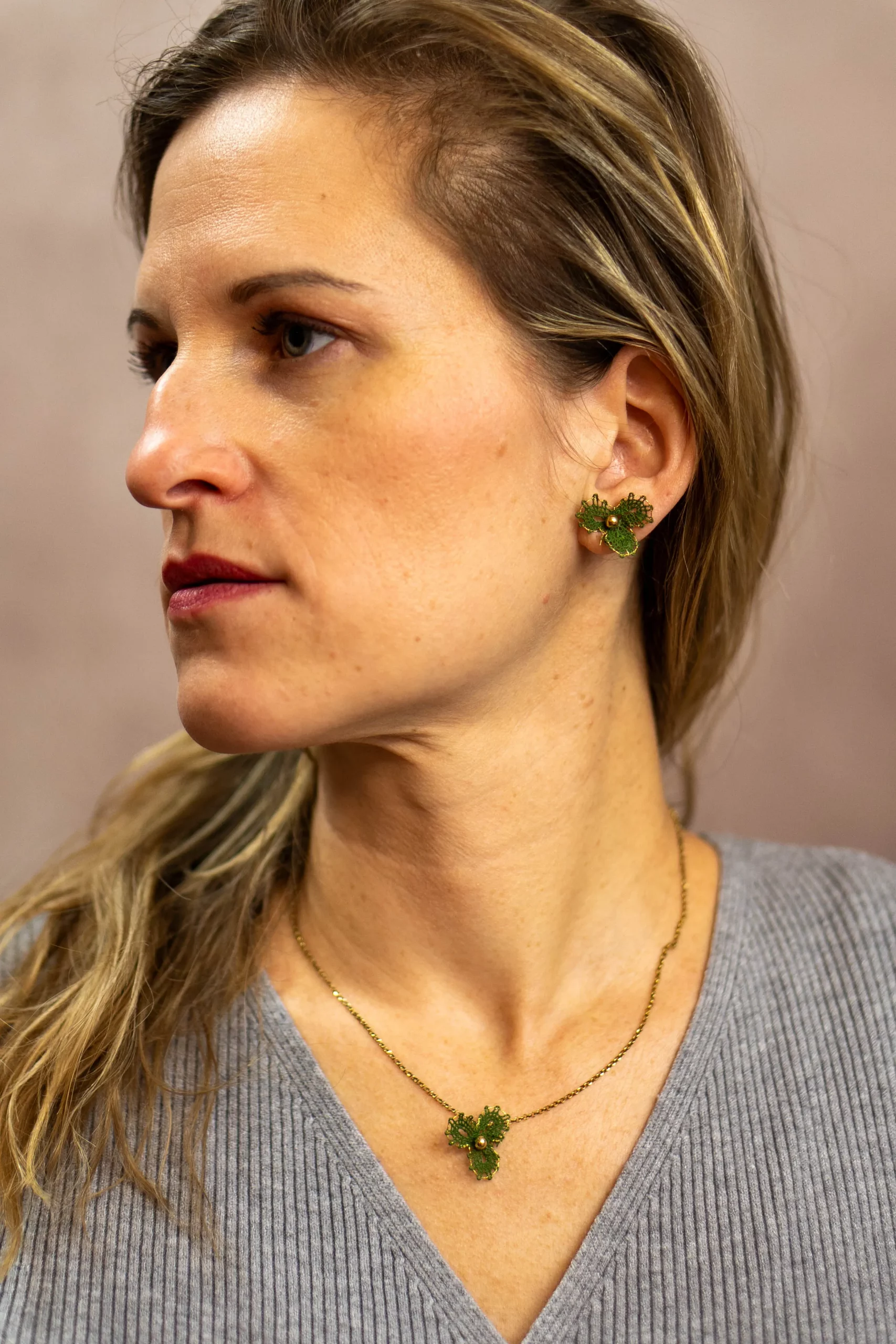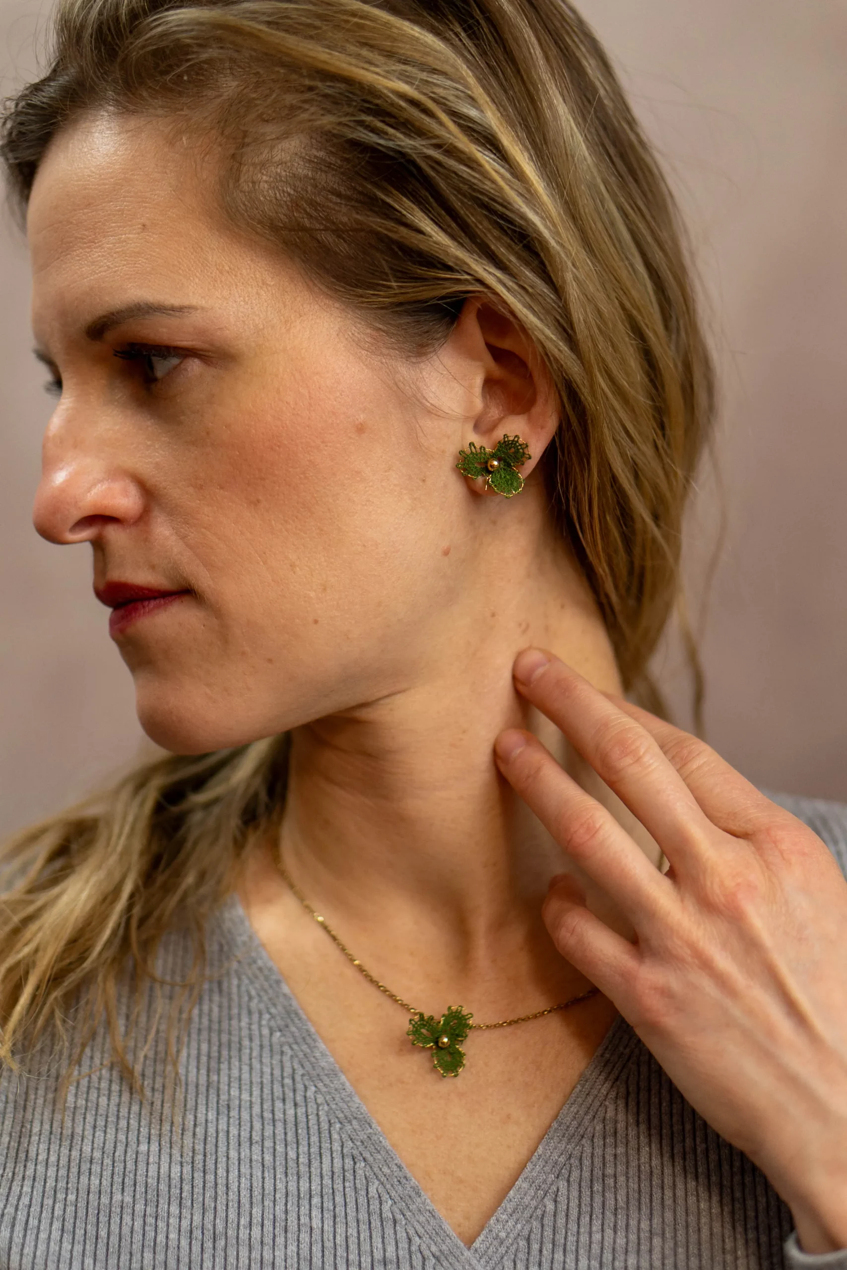Handgeklöppeltes Schmuckset, bestehend aus einem Paar Ohrsteckern und einer feinen Halskette. Eine Verbindung aus der die Natur beschwörenden grünen Farbe und traditioneller Handwerkskunst. Ein zeitloses Accessoire mit vergoldeten Metall-Accessoires.