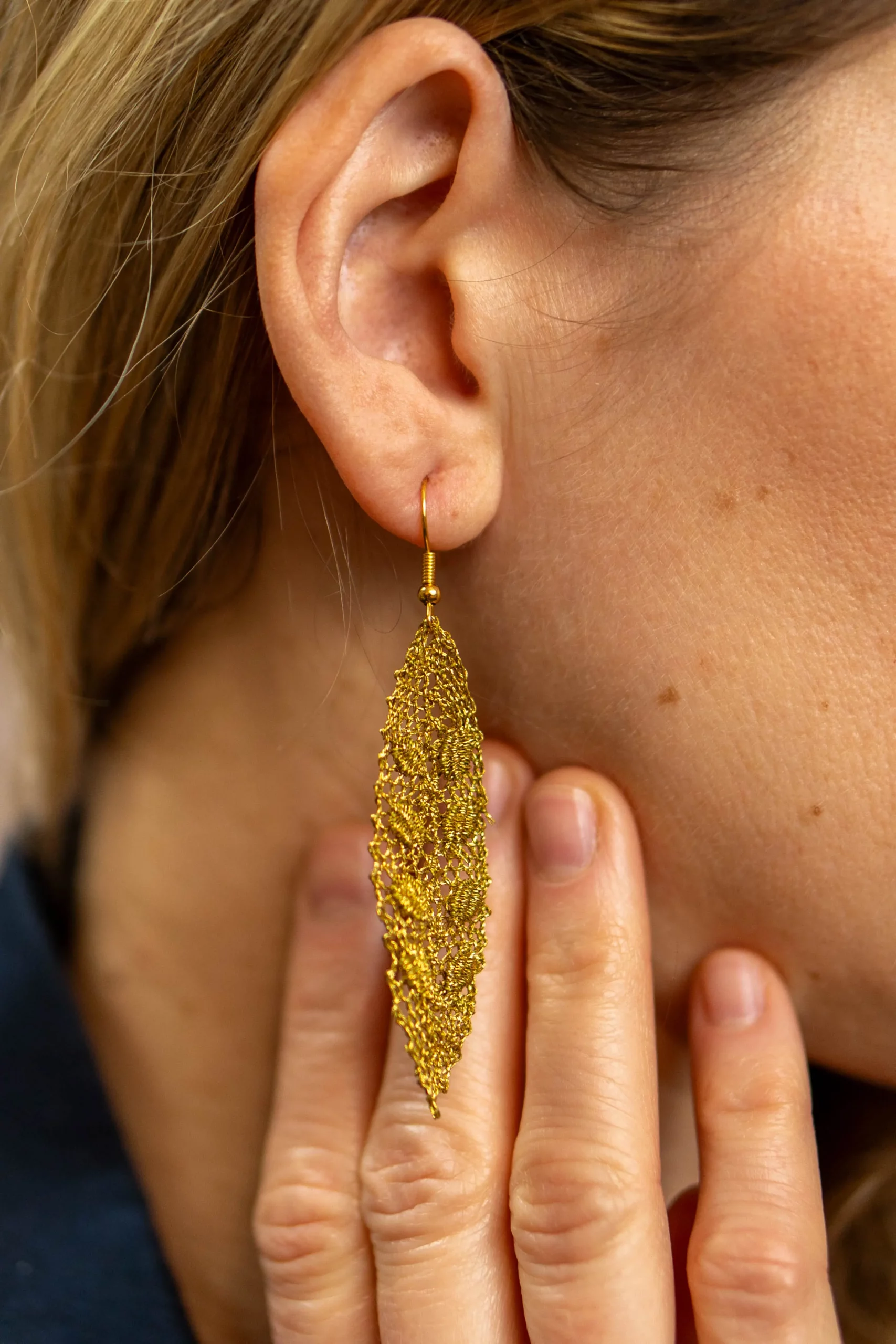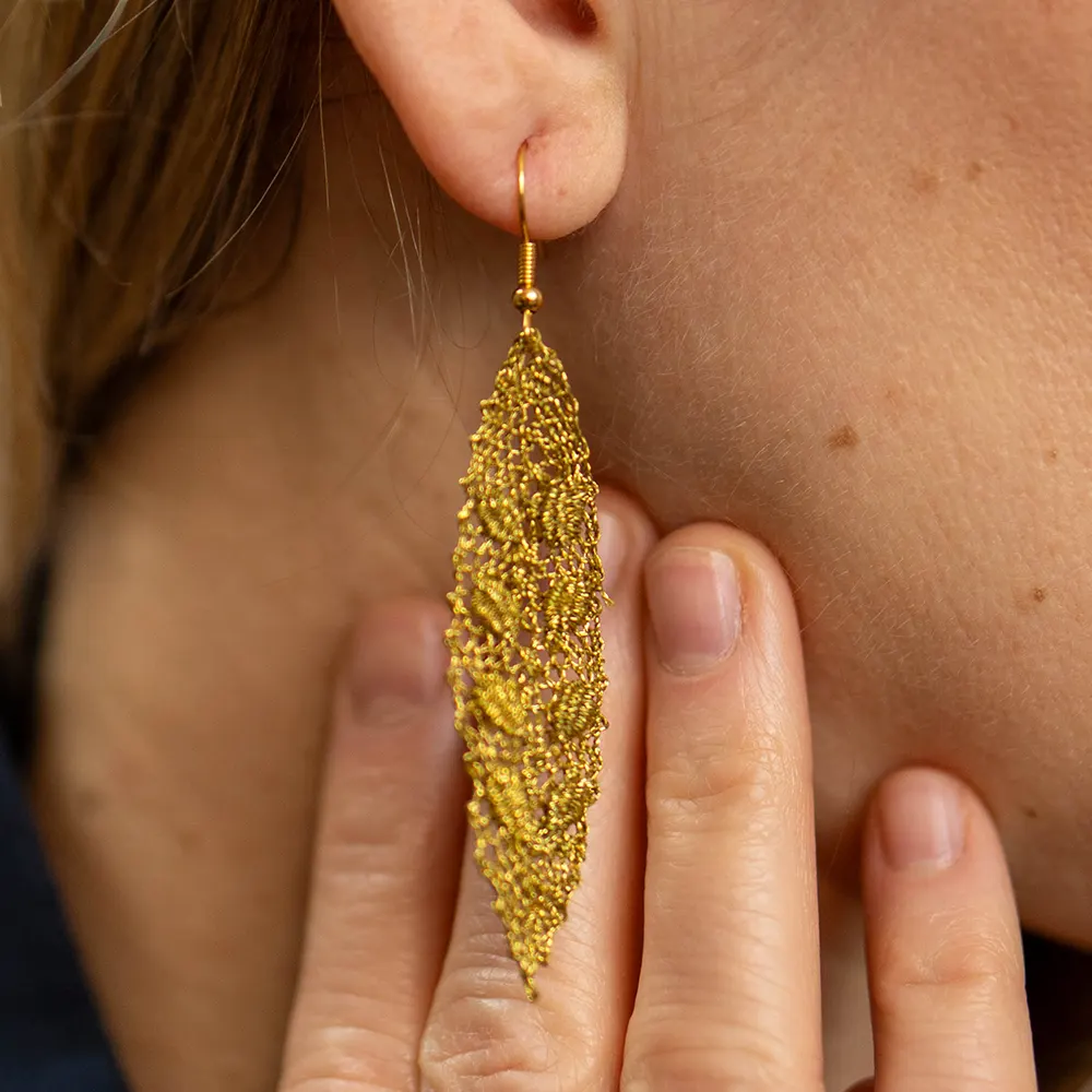 In klassischer Klöppeltechnik gefertigte, goldfarbene Ohrringe in Blattform. Die Verbindung von naturinspirierter Form und traditioneller Handwerkskunst verleiht dem Auftreten eine feine Eleganz. Ein zeitloses Accessoire für Liebhaber einzigartiger Werte.