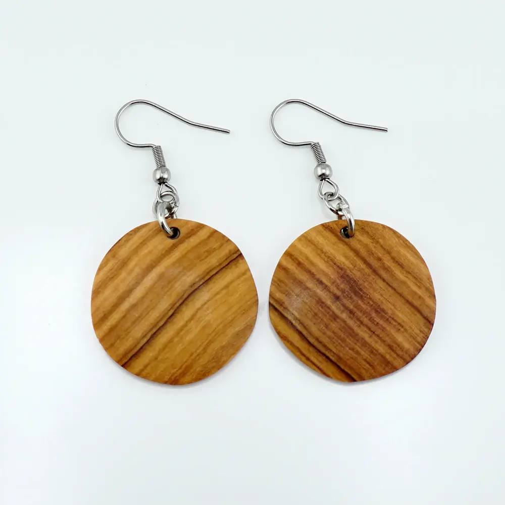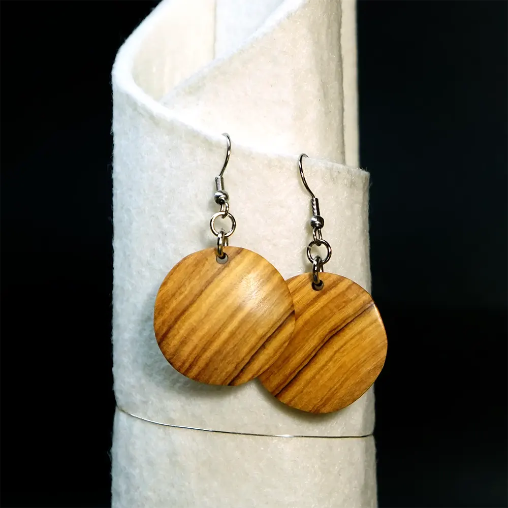 Langlebig & Hautfreundlich: Die 30mm großen Holzscheiben sind sorgfältig geschliffen und werden von hochwertigen Haken aus Edelstahl gehalten. Perfekt für Allergiker und Liebhaber von langlebigem Design.