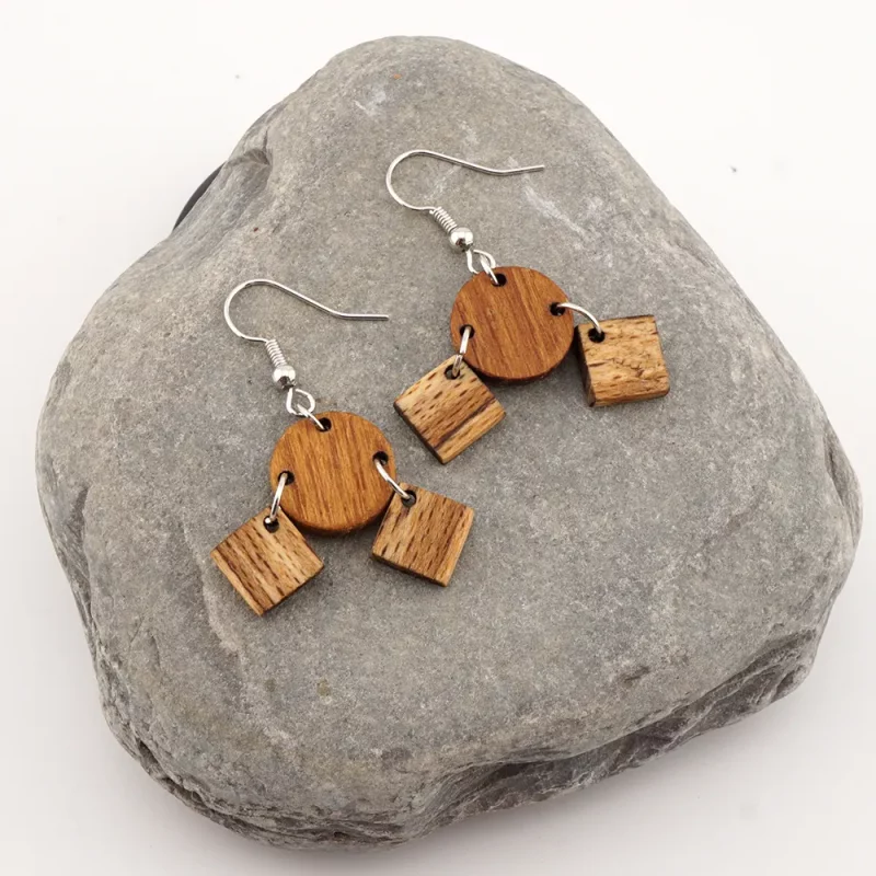 Geometrisches Duo: Quadrat & Kreis – Handgefertigte Ohrringe aus Padouk & gestockter Buche